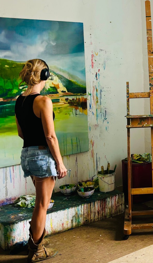There is a recurring theme of landscape in her work with the use of colour as a visual language which makes a strong impact. This is achieved by her preferred medium of oil paint. This is because of the intensity of colour and light that is achieved through numerous layers of glazes. Beginning with thin washes of colour, followed by a process of building up of more opaque layers to reflect what is beneath. Through this process, there is a continual removal and addition of medium until she comes to a place of contentment and resolution. Jacinda describes herself as an emotive colourist, producing work that creates escapism not just for herself, but also for the viewer.