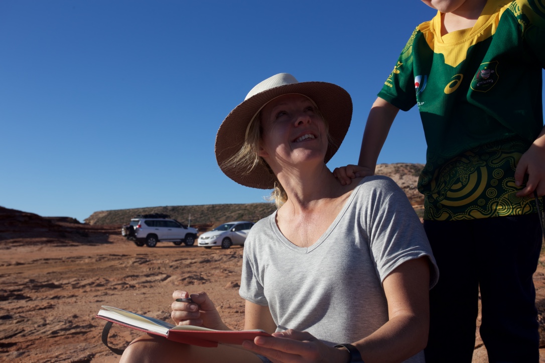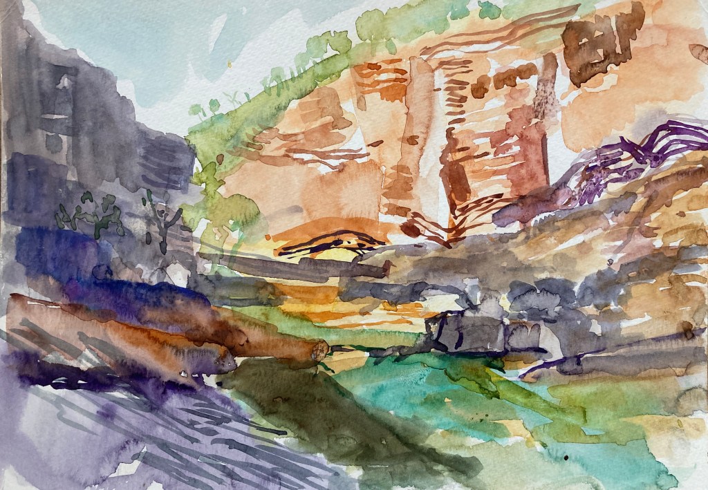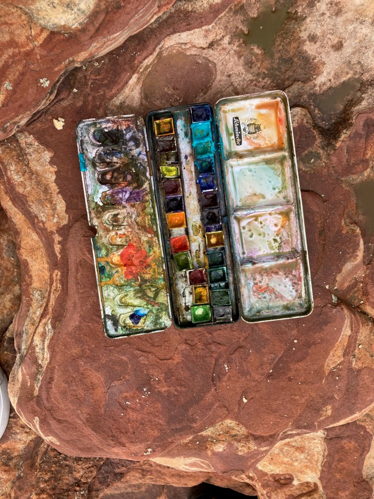 I have travelled with this little box for 10 years now. It is filled with colours I choose individually. I change out colours when going to different places especially Pilbara and Kimberley. Sometimes I am lucky enough to use pigments like ochre found out in the landscape. I also have mixed the rich red dirt with water to create washes.